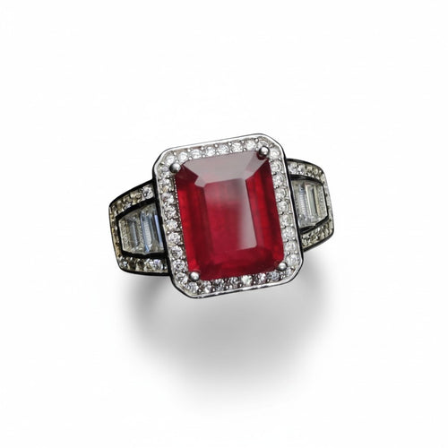 Crimson Statement: Natural Emerald-Cut Ruby Ring with Geometric CZ Halo in 925 Silver